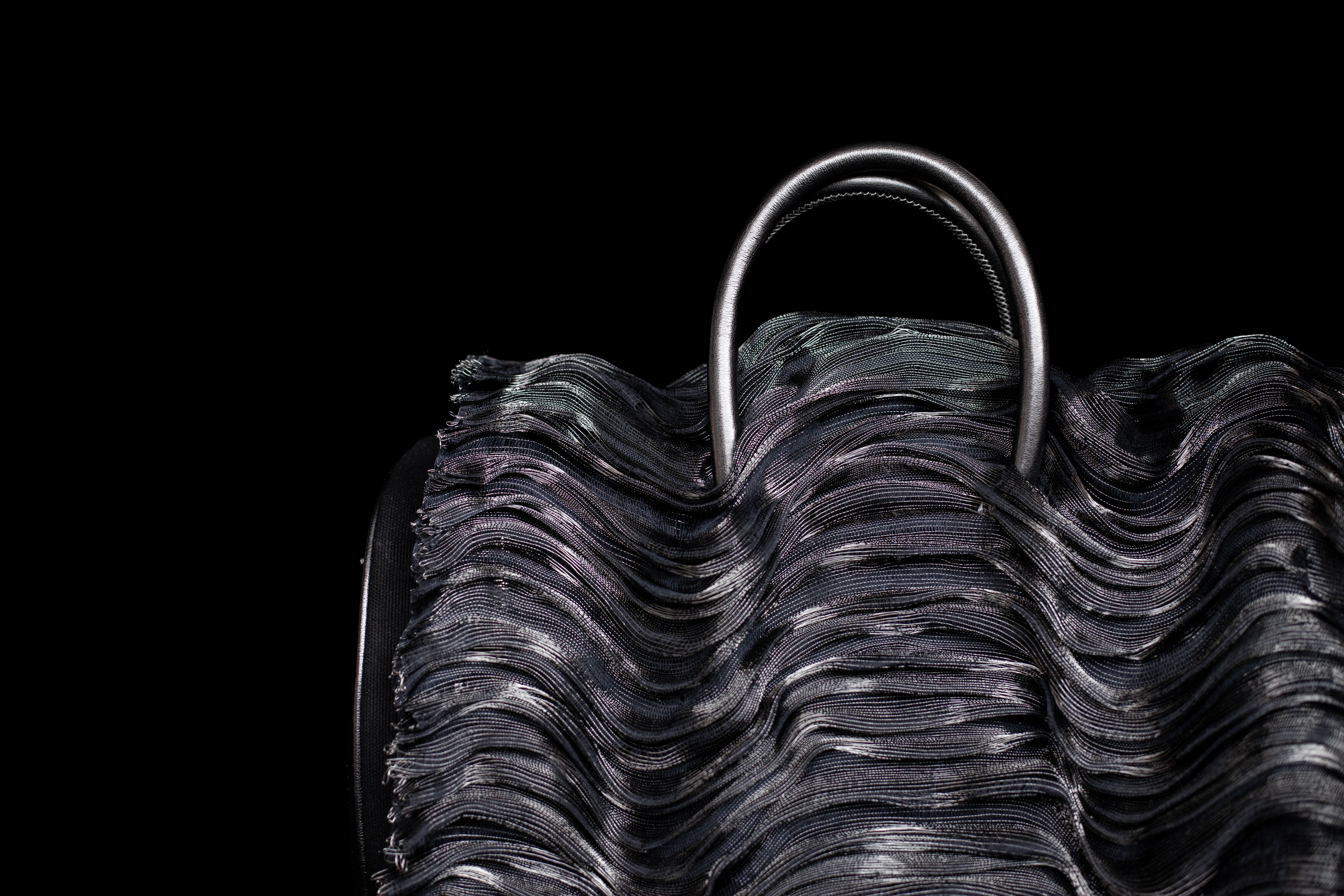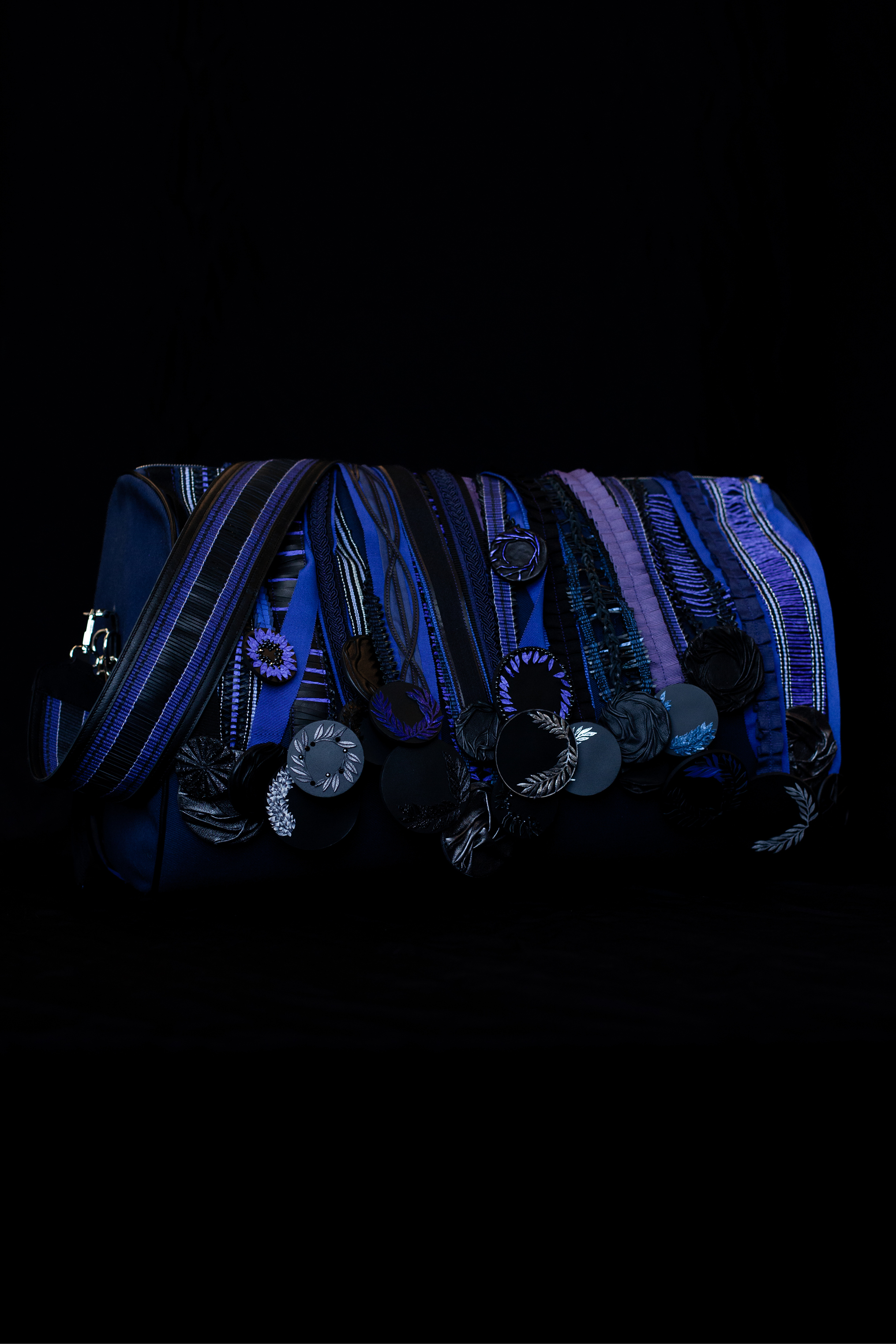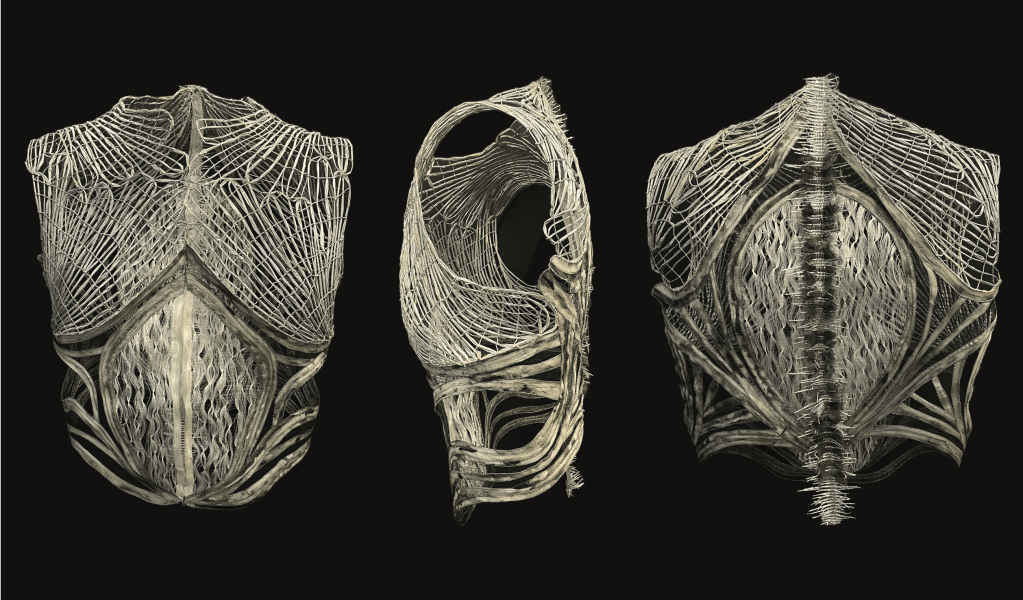 Ma première collection de 7 bagages et 2 pièces vestimentaires de performance. Née de l’étude des transformations musculaires d’un sportif tout au long de sa quête d’un trophée, la collection explore une vision radiographique des modifications physiques subies par le corps, réinterprétées par mes soins à travers des techniques de nouages, tressage, broderie au crochet de Lunéville, travail du cuir déconstruit et déstructuré.